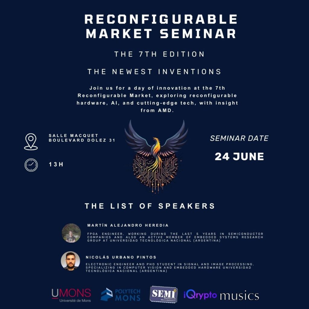El 24 de junio, en el marco del convenio con la Université de Mons (Bélgica), los ingenieros Martín Heredia y Nicolás Urbano Pintos representaron a la Facultad Regional Haedo de la UTN en la 7ª edición del seminario Reconfigurable Market, un encuentro internacional sobre hardware reconfigurable, inteligencia artificial y tecnologías de vanguardia, que contó con la participación de especialistas de AMD, investigadores y representantes de diversas instituciones y empresas.